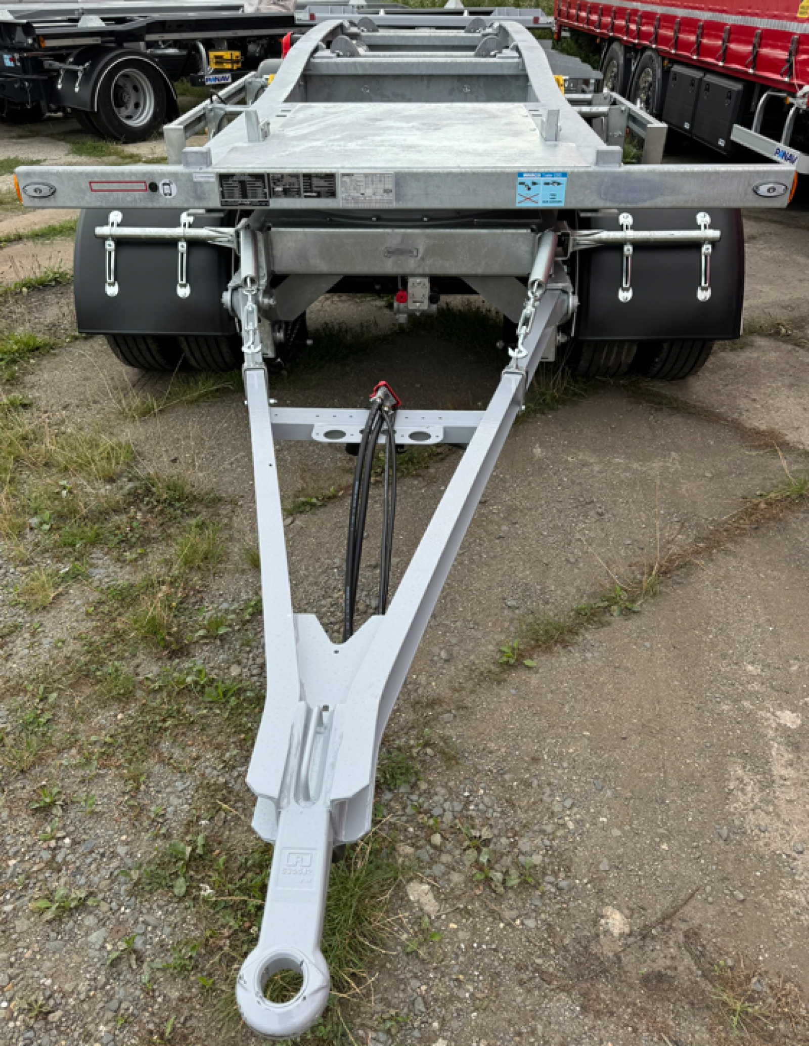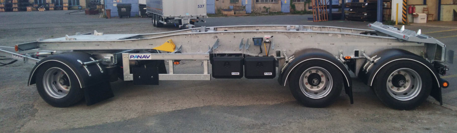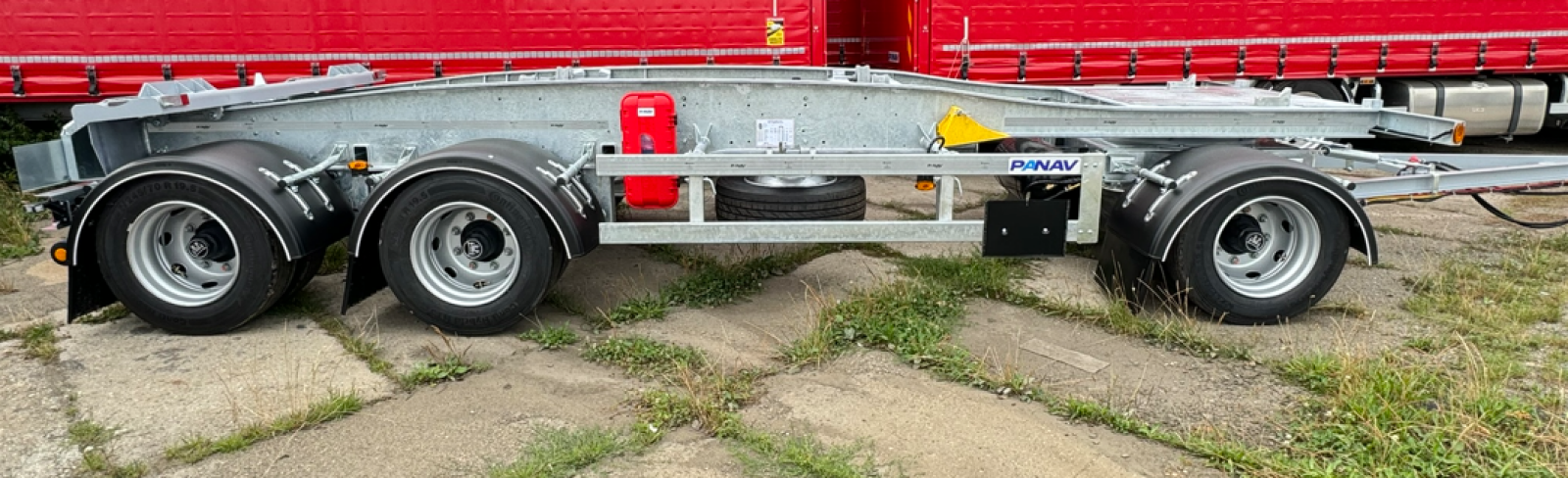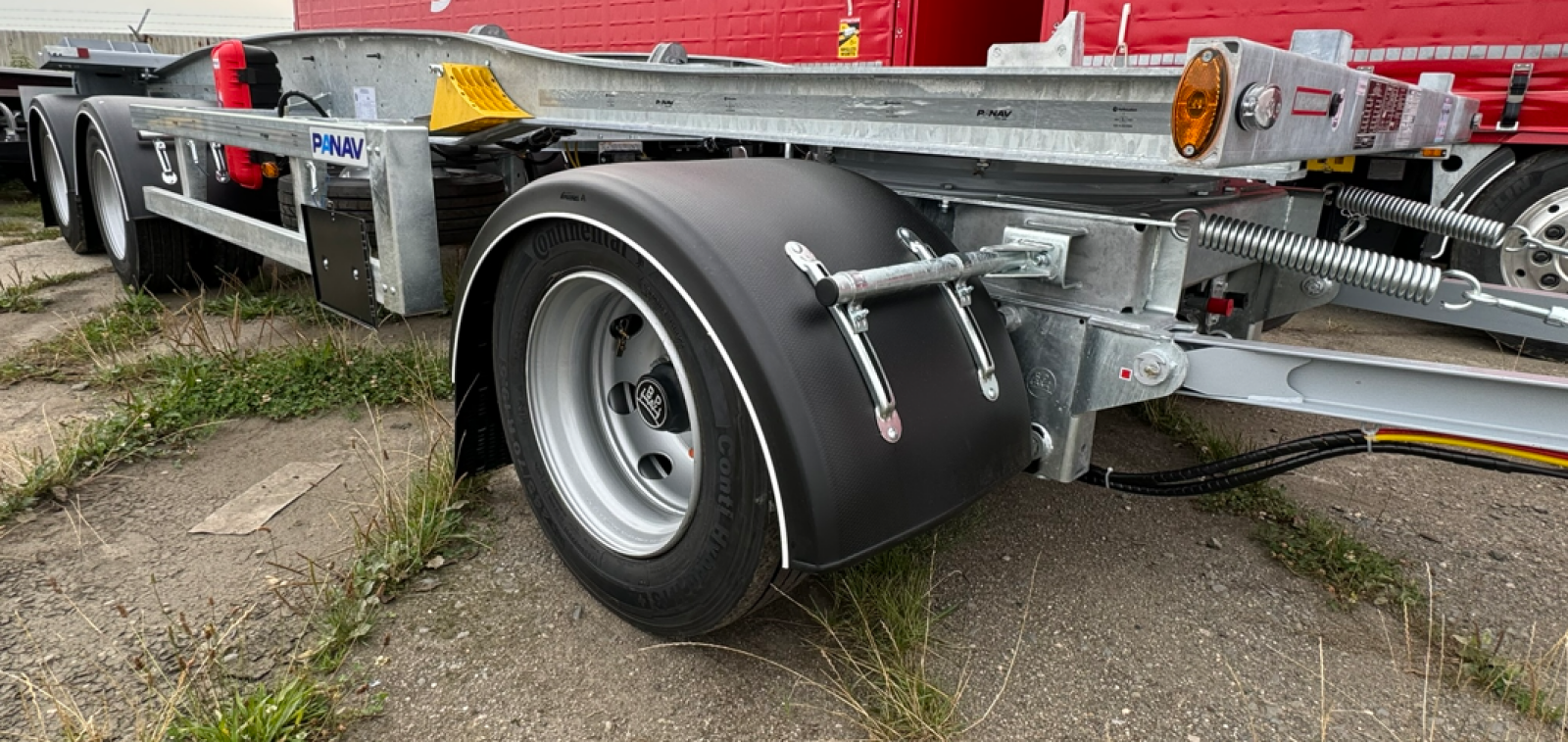 BPW air-suspended axle aggregates, disc brake, dual-mount tires 245/70 R 19.5 Continental, automatic lifting of the 2nd axle, drawbar with eye dia 50 mm with a length of 2400 mm, automatic release of trailer suspension bags after disconnecting the EBS cable