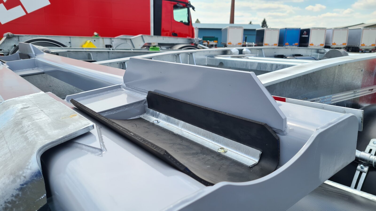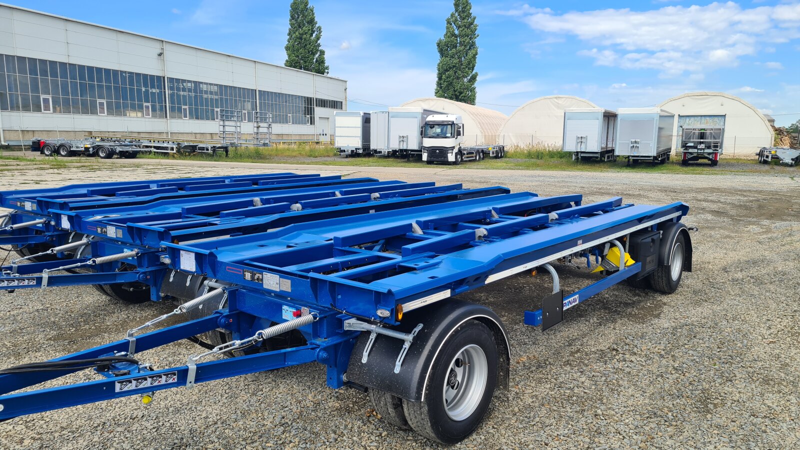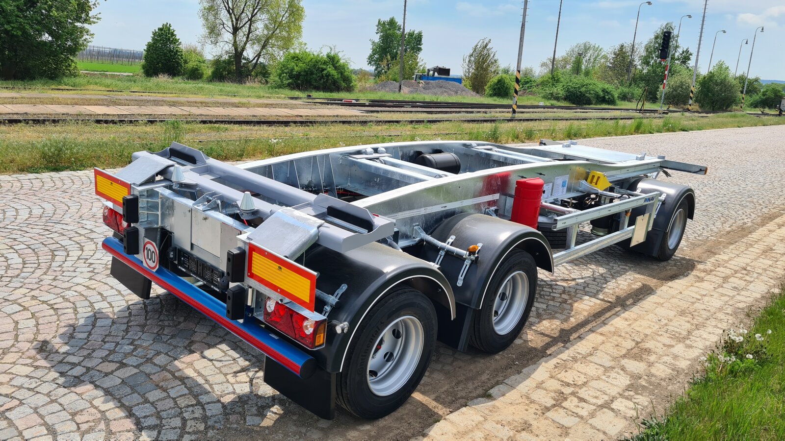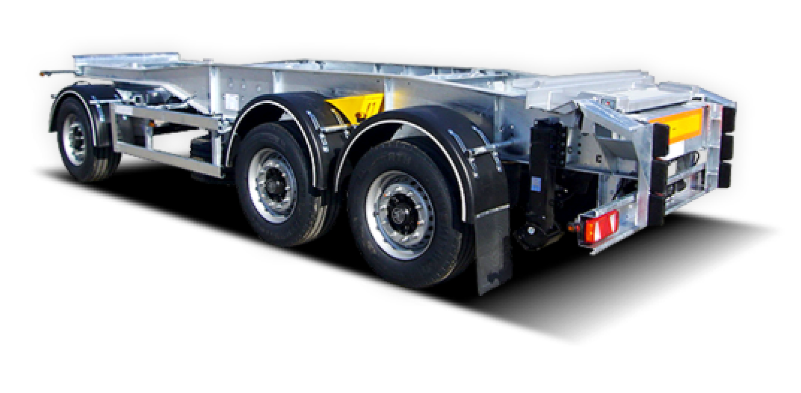 for loading rolling containers (DIN and MSTS) and bath containers, two frame concepts are available, with a running surface and with a trolley for storing container rollers, which travels along the trailer frame