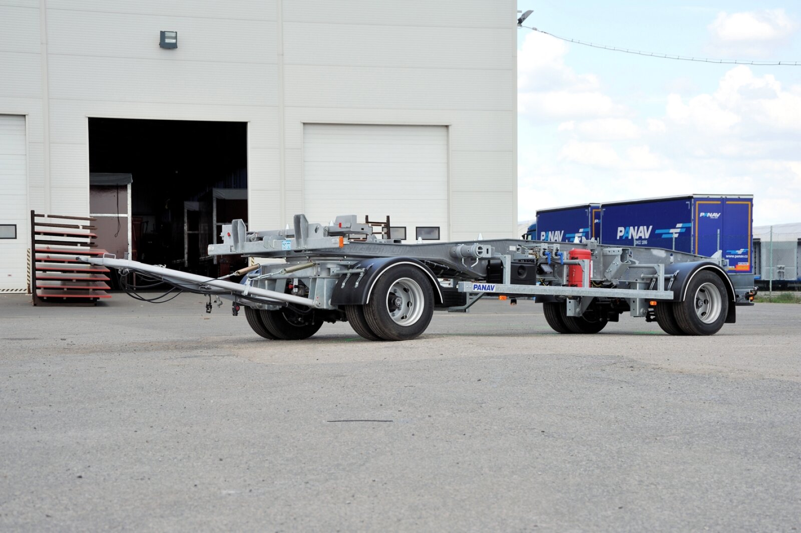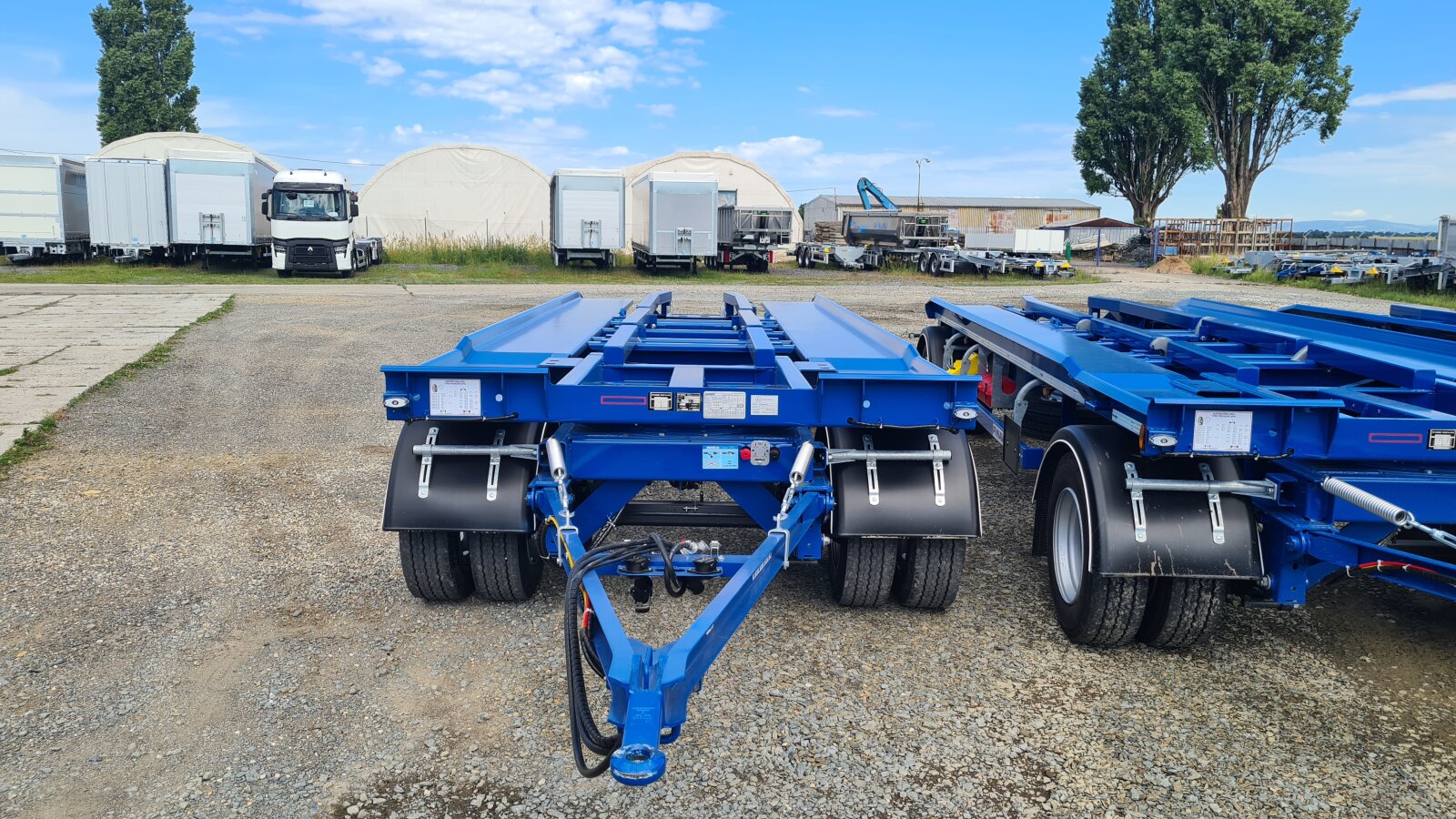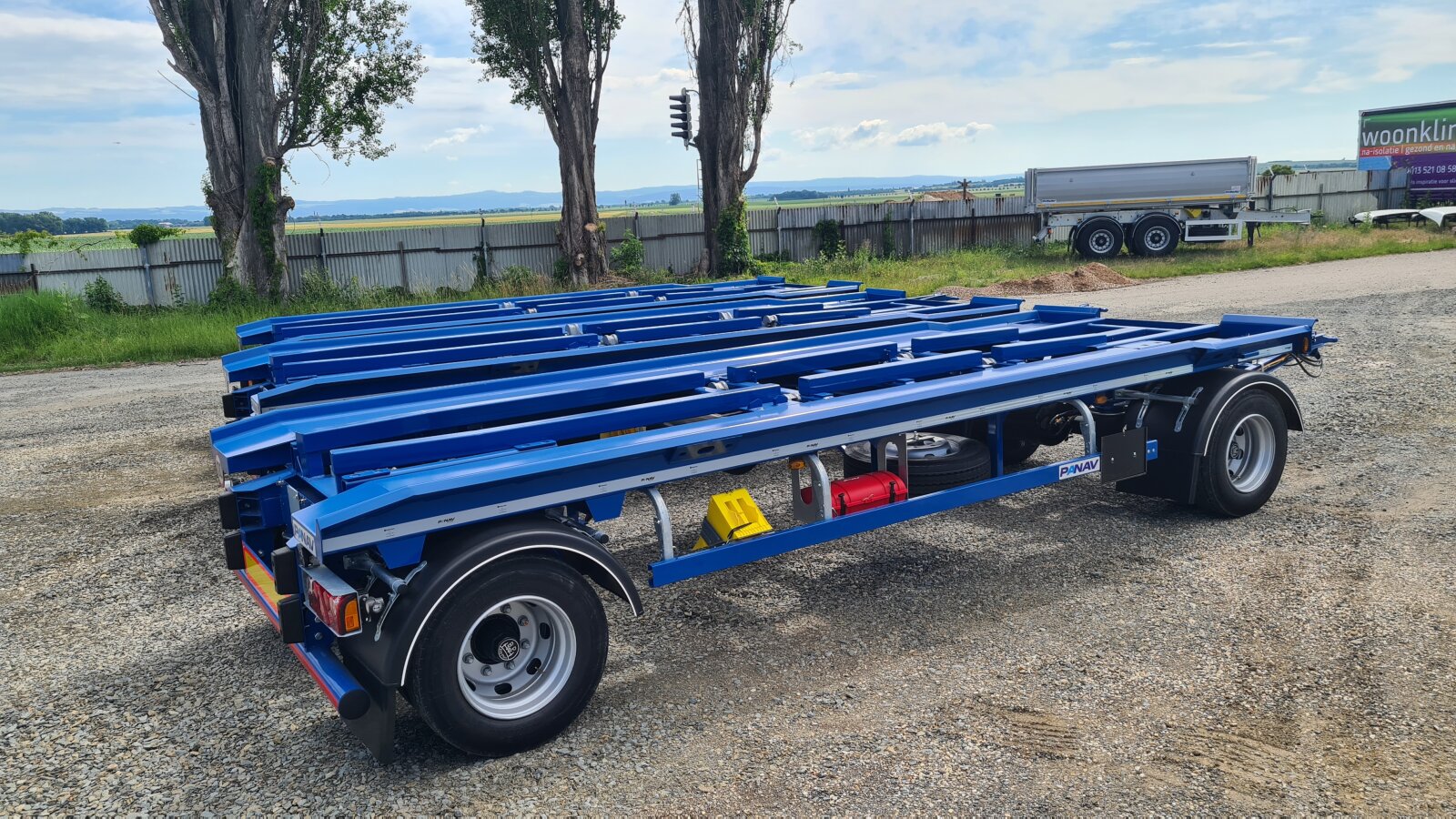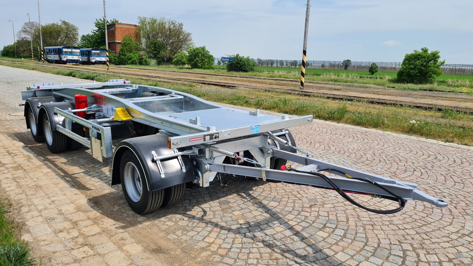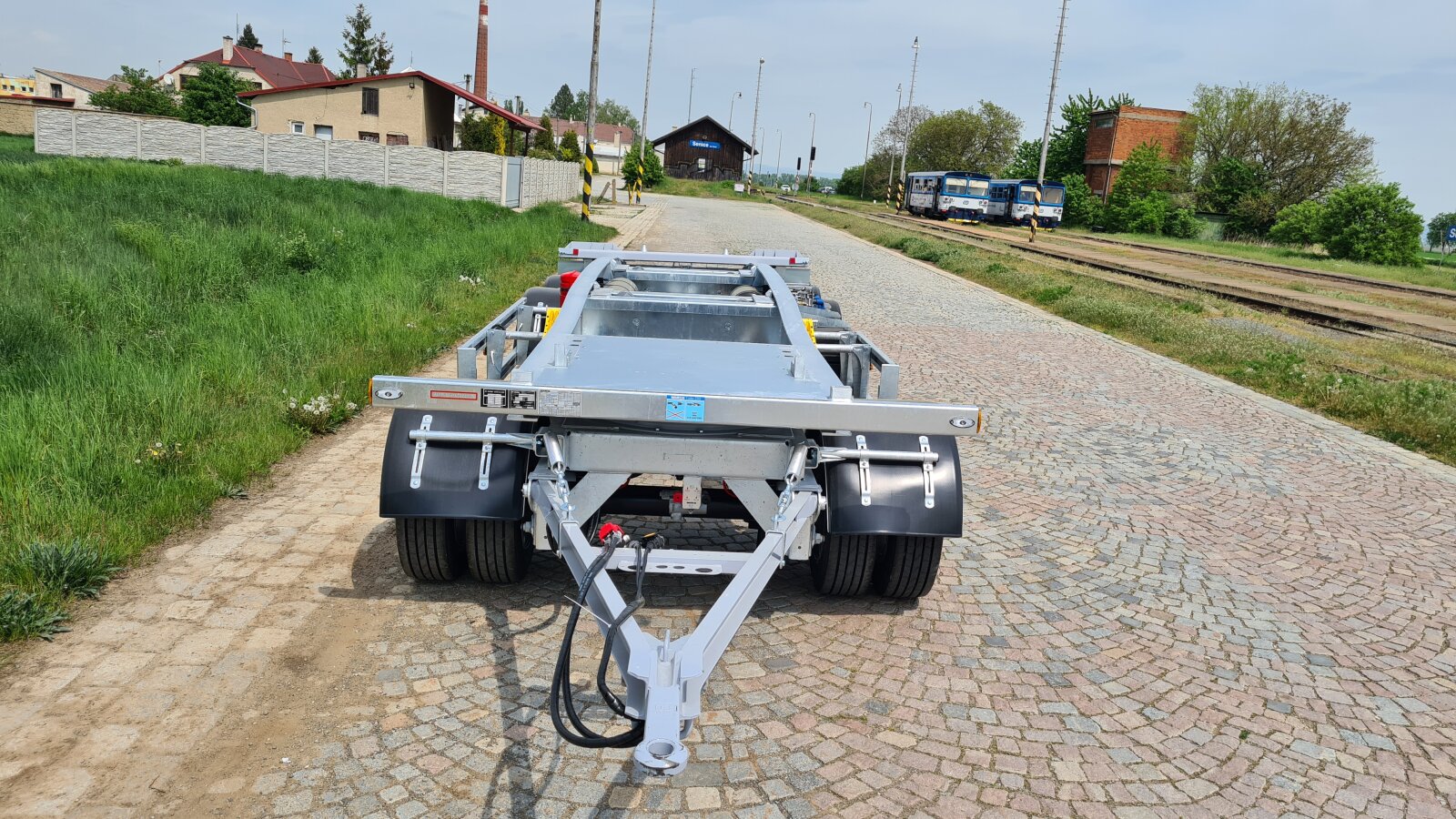 for loading rolling containers (DIN and MSTS) and bath containers, two frame concepts are available, with a running surface and with a trolley for storing container rollers, which travels along the trailer frame