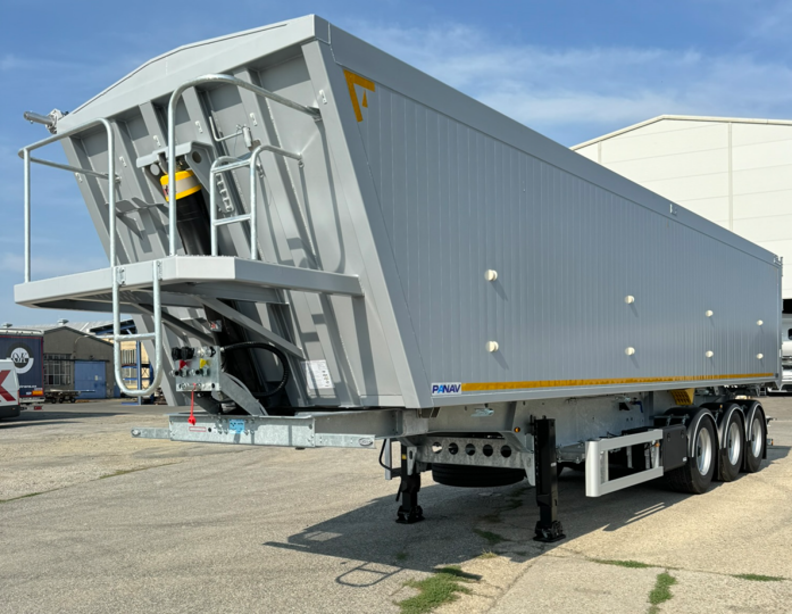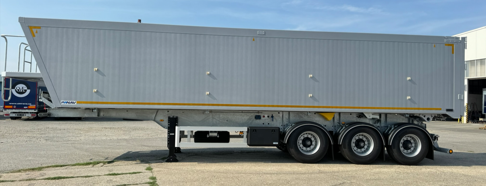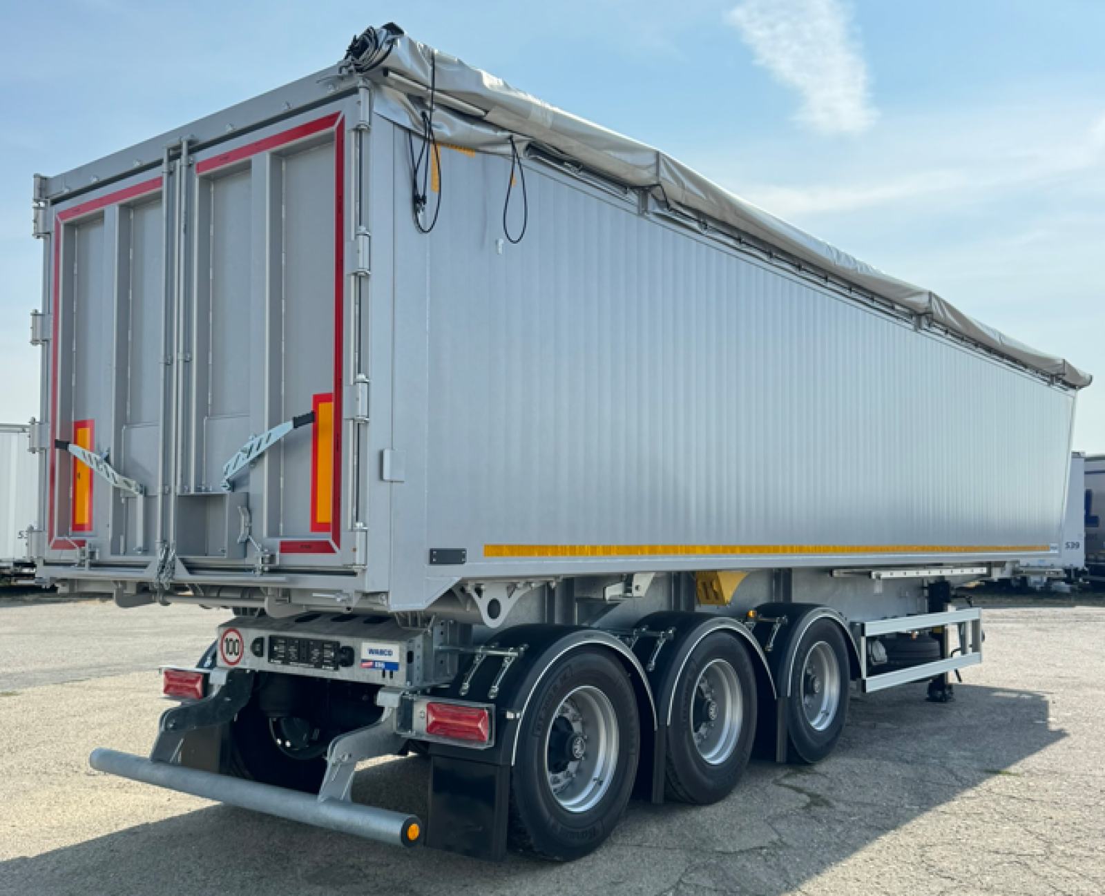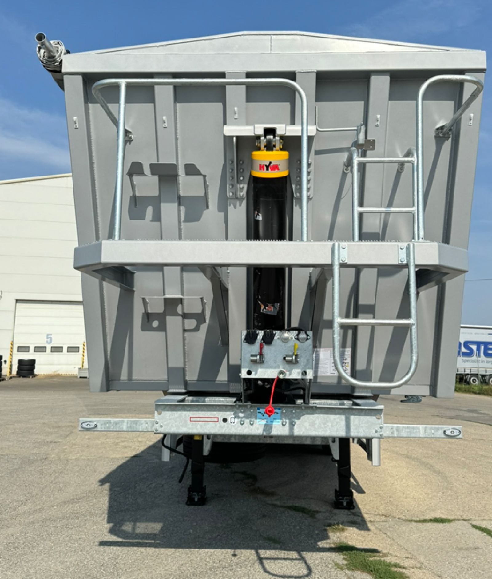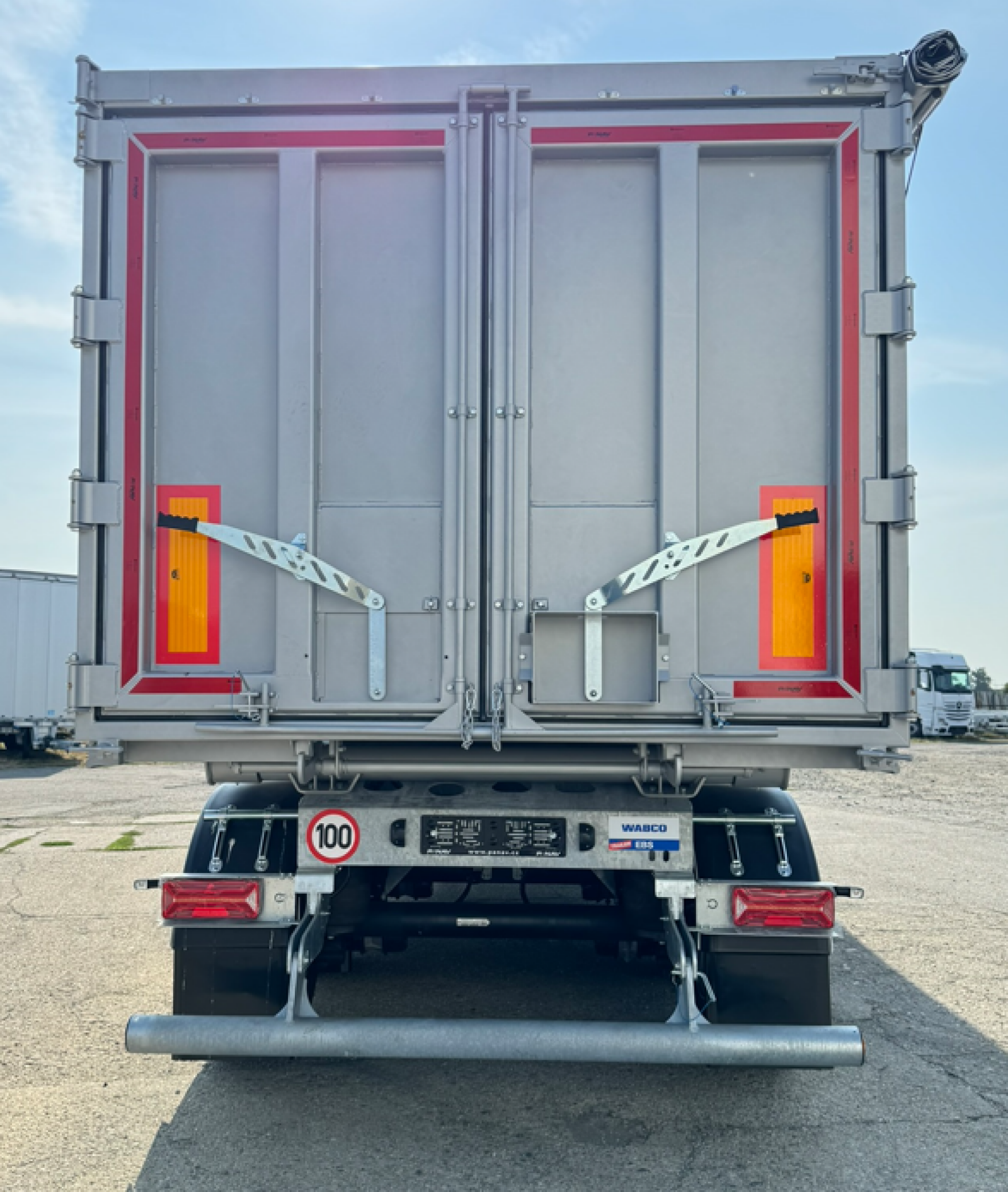 All-aluminum body with a volume of 50 m3, swinging rear front + double-wing doors (1/2-1/2), dump window (2x), floor made of aluminum sheet 7/10 thick is reinforced "U" profile, side walls welded from closed profiles 30 mm, inner wall 3 mm thick, sloping from end, tarpaulin on the side with a service bridge, 3 x truss + 3 x tension chain, extension for the handle to the loading window