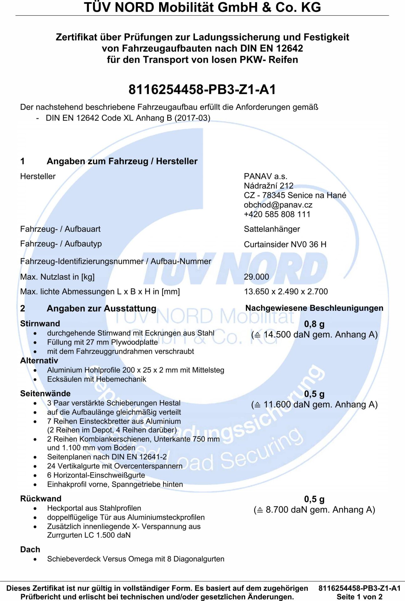 150 mm. Náklad může být naložen v celé světlé výšce ložného prostoru, avšak minimální výška nákladu je 800 mm. Součinitel tření mezi ložnou plochou a nákladem musí být nejméně μ = 0,3. Nejsou přípustné výstupky, nebo ostré hrany s rádiusem menším než 2,5 mm. Při každé přepravě musí být namontovány a zajištěny všechny pohyblivé nebo odnímatelné díly nástavby (uzávěry plachty, dveře, apod.). Doporučená výbava jsou dvě vázací soupravy umístěné křížem co nejblíže u zadních vrat. Při každé přepravě je potřeba stanoveným způsobem zajistit veškeré pohyblivé nebo odnímatelné díly nástavby.