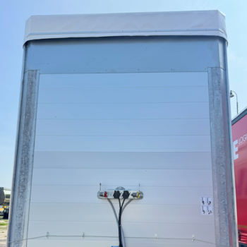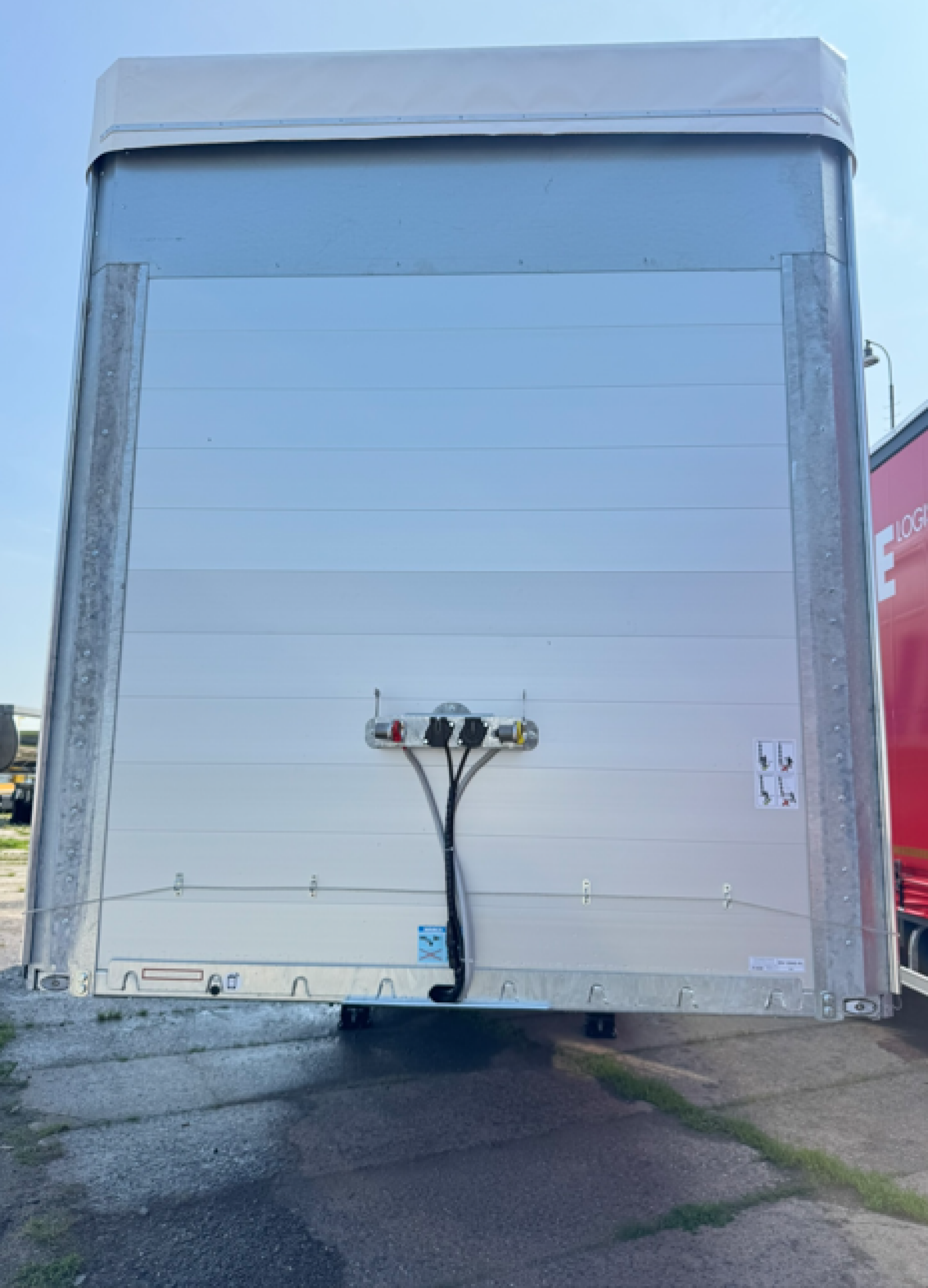 Aluminum front end, one pair of anchor elements in the front end according to EN 12 640, trench plywood 9 mm, steel corner posts, three-piece tarpaulin, Hestal folding posts (3 pairs), rear door, lifting tarpaulin structure, two-level roof, "HERKULES" lever lifting, customs cable