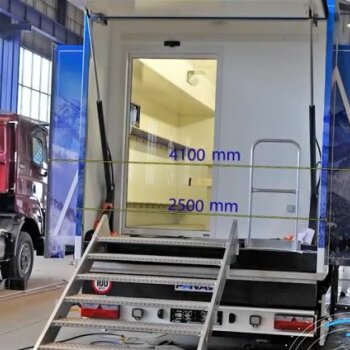 Evžen na první pohled vypadá jako běžný kamionový návěs, jeho nestandardní vlastnosti ale vyniknou při rozložení bočních výsuvů. Půdorys návěsu, který se na silnici může pohybovat s celkovou hmotností až 25 tun, se totiž z běžných dvou a půl metru rozšíří na více než čtyři metry, s instalovanými schůdky má Evžen šířku dokonce téměř pět metrů a délku přesahující šestnáct metrů.