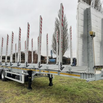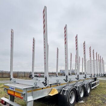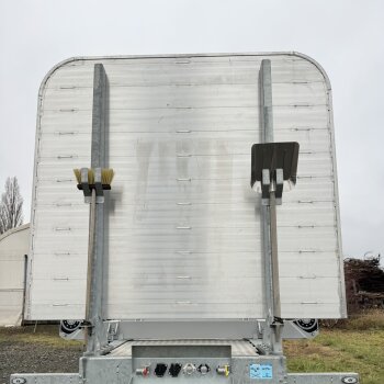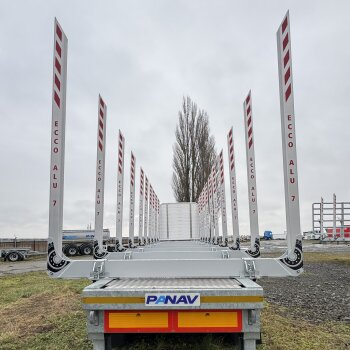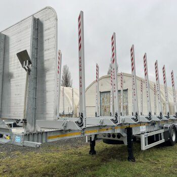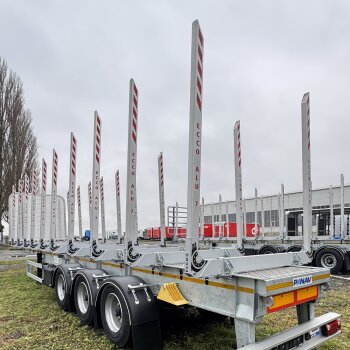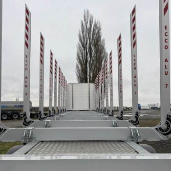 Steel, hot-dip galvanized, front parking feet, replaceable JOST 2", suspension pin, 8 pairs of lashing strap holders, 2x rear rescue hook, aluminum rear bumper, aluminum side guards, covered space between the side members, plastic fenders + antispray