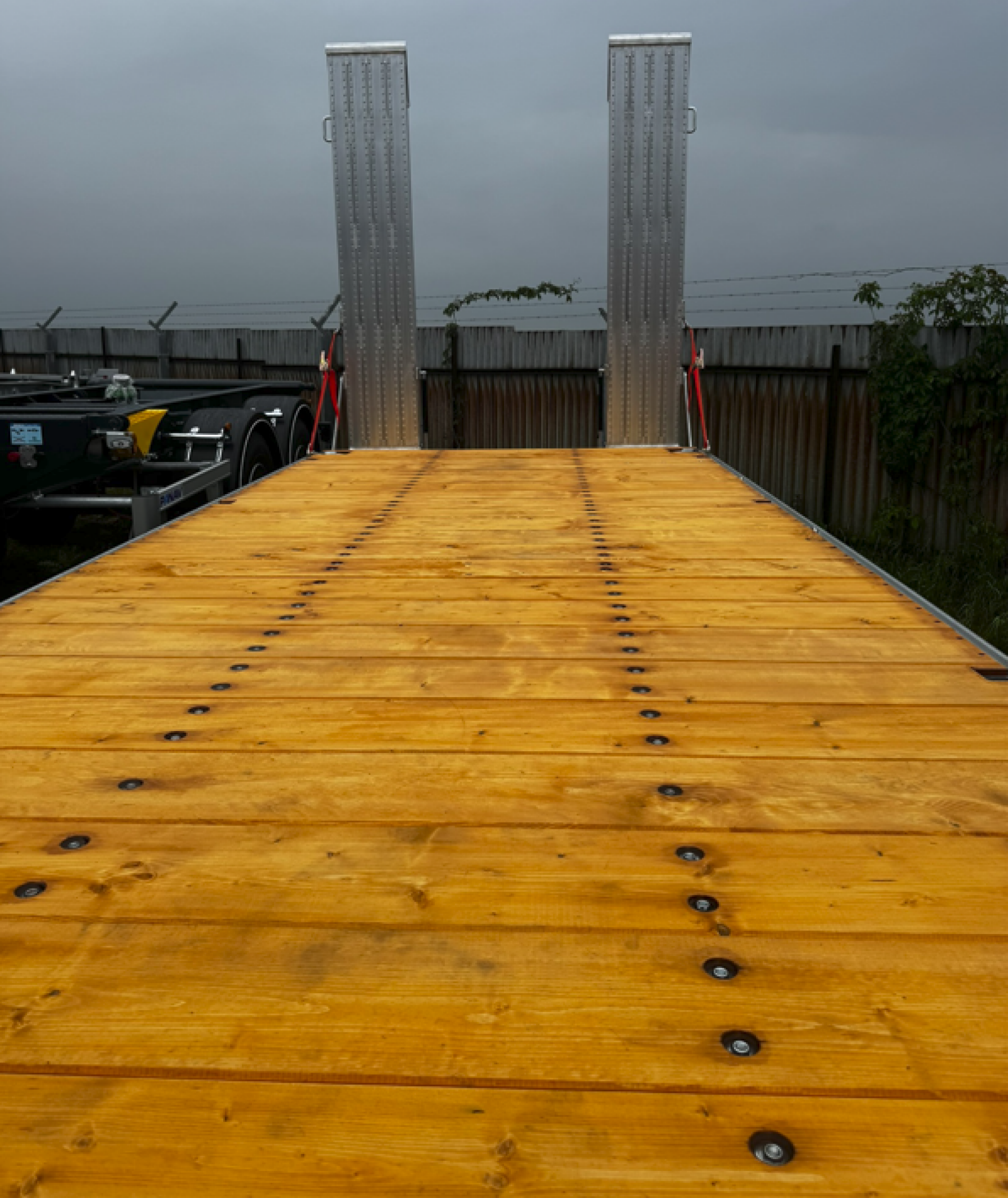 Dřevěné desky tl. 40 mm, po jednom páru ok vpředu a vzadu v rozích rovné části podlahy, 7 párů kotevních úchytů v okrajovém profilu
