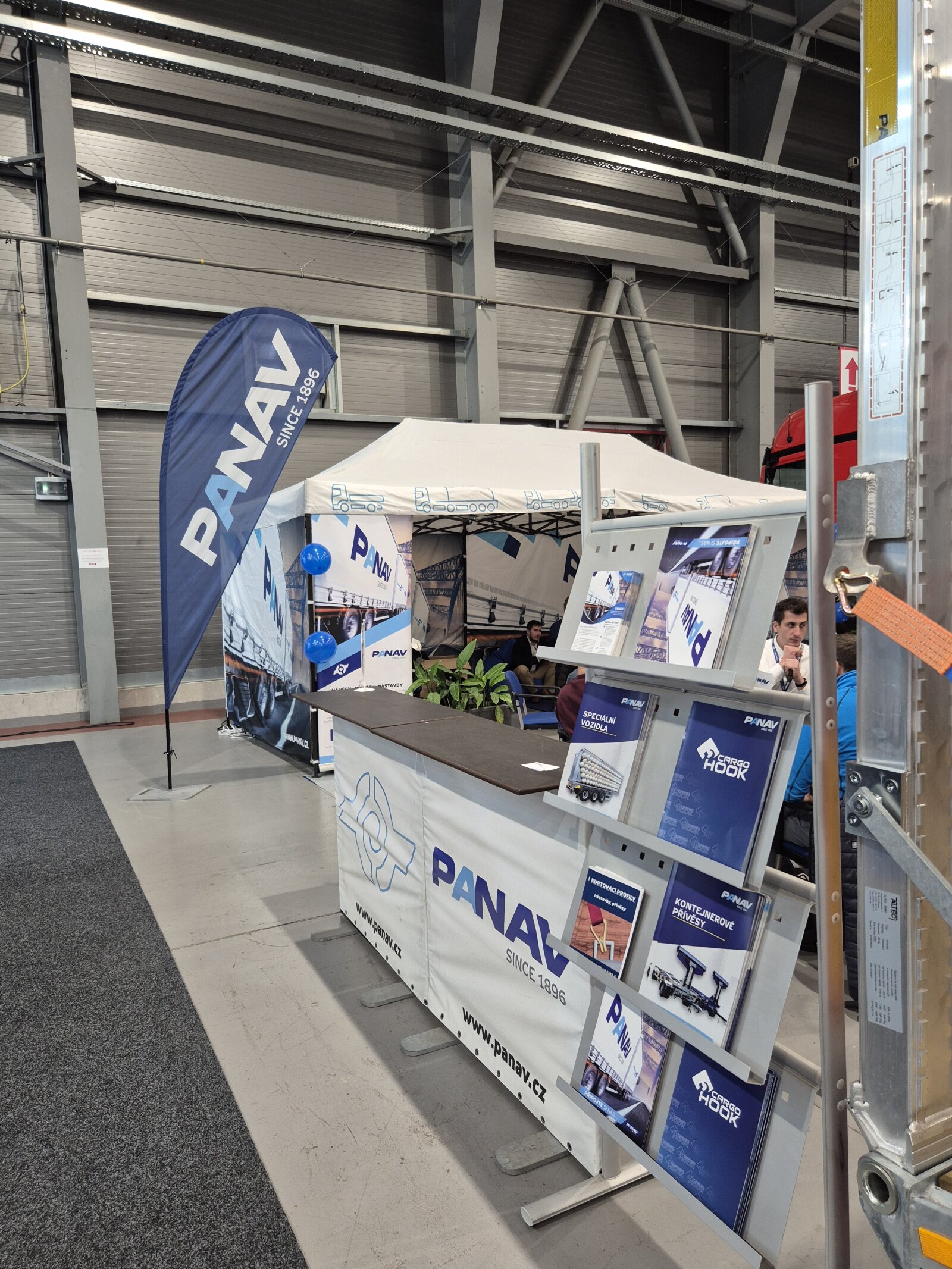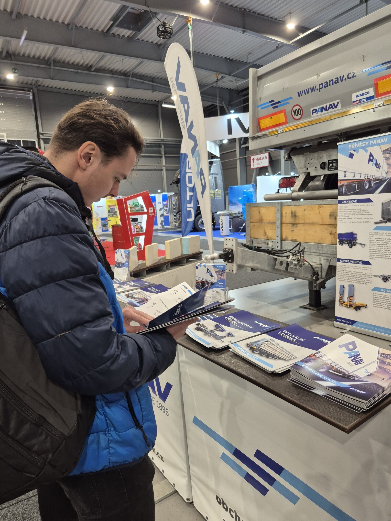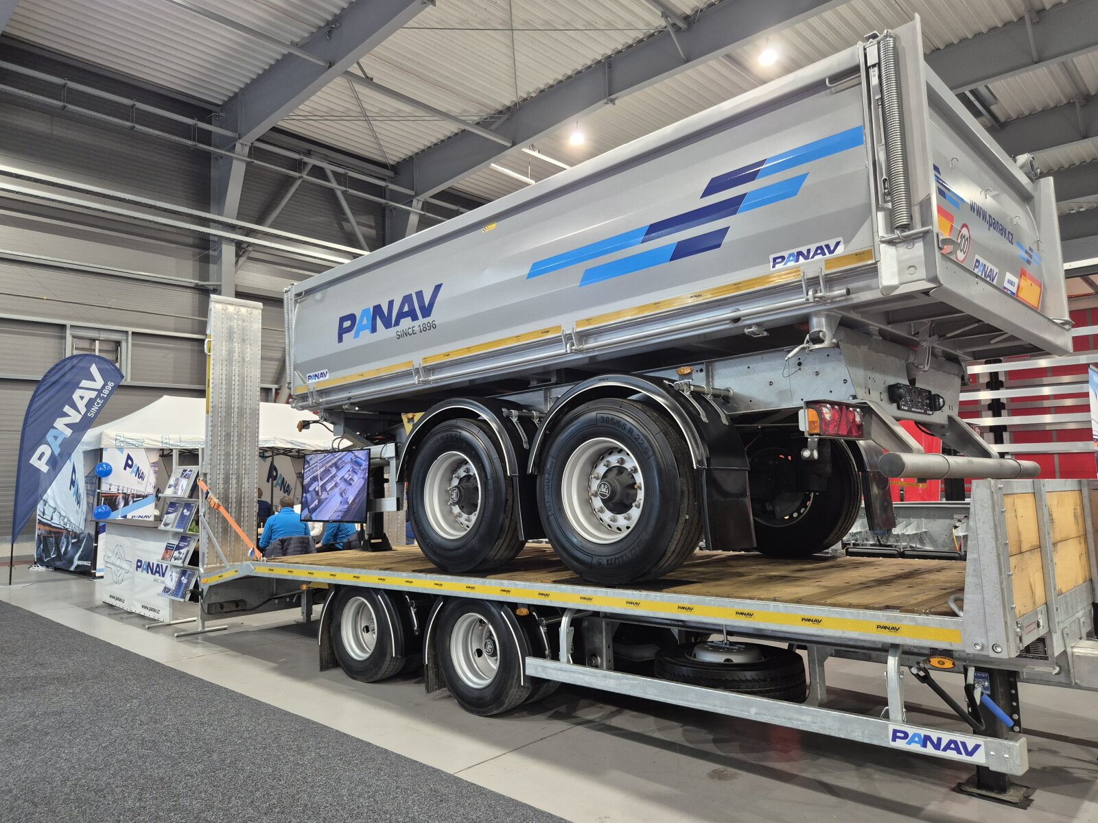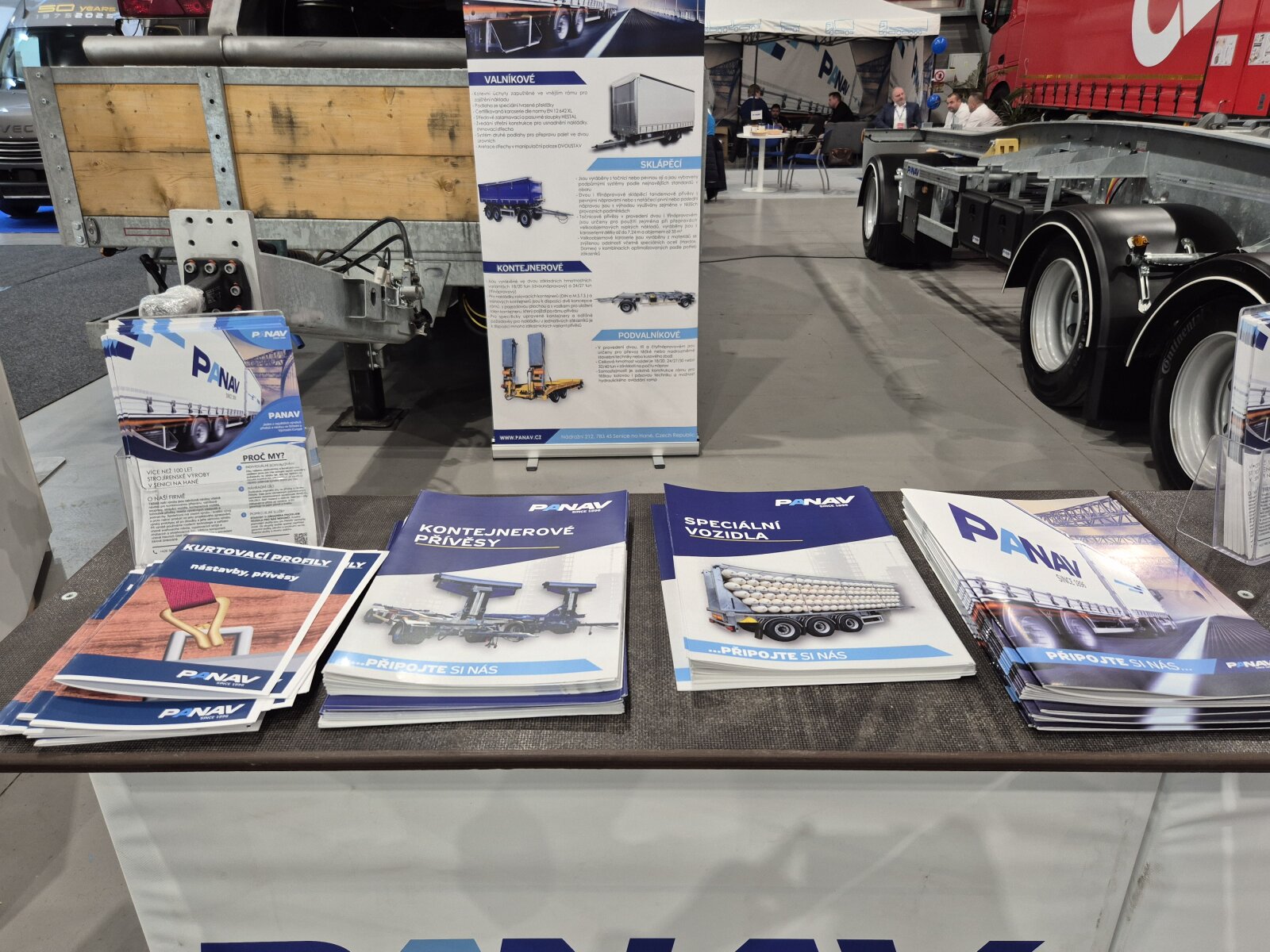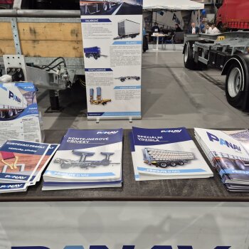 Příchozím jsme na našem stánku ukázali valníkovou velkoobjemovou soupravu ANV+TVK18M, tandemový sklápěcí přívěs TS318H, plošinový tandemový přívěs TP018L a kontejnerový přívěs PVC24M_ALOIS.